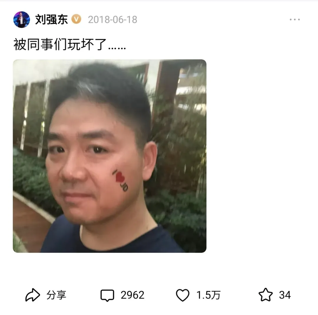 再到如今,大大方方调侃自己的“丑照”,并趁机为京东和家乡做宣传,刘强东再次展现了他特有的亲民风格。