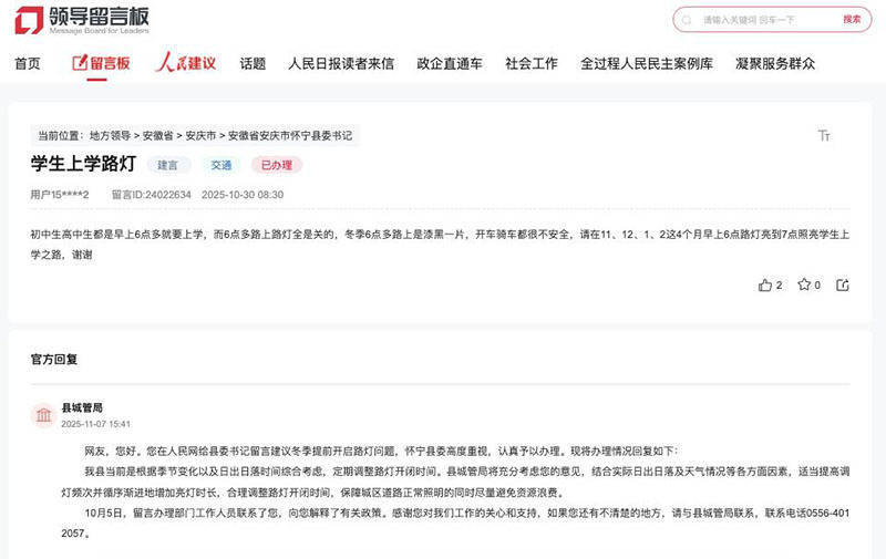 怀宁县城管局在回复中表示,将充分考虑网友的意见,结合实际日出日落及天气情况等各方面因素,适当提高调灯频次并循序渐进地增加亮灯时长,合理调整路灯开闭时间,保障城区道路正常照明的同时尽量避免资源浪费。