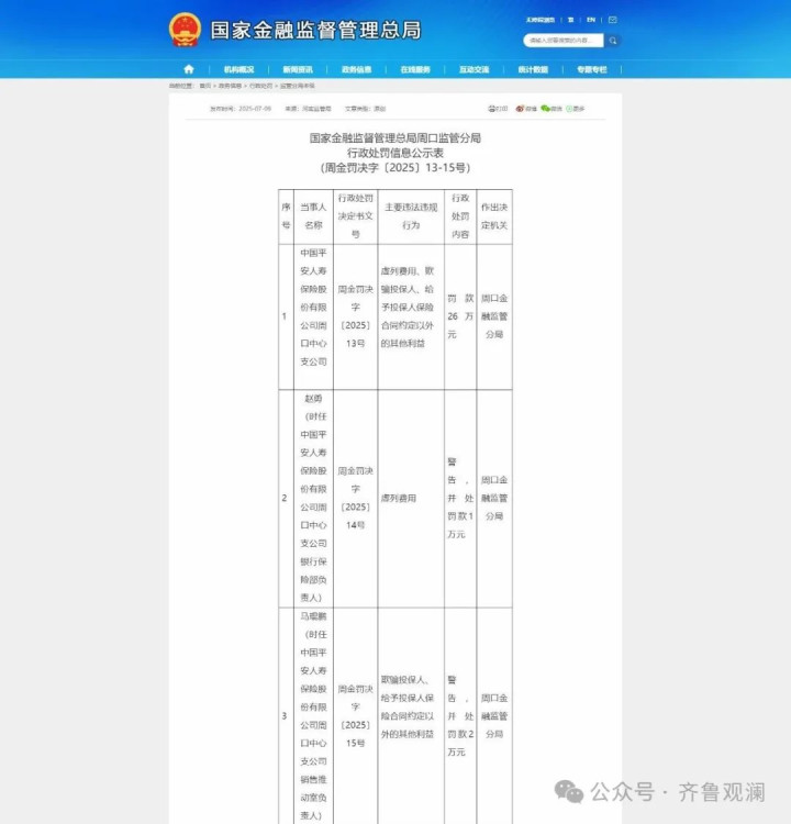 7月9日,周口金融监管分局公布的行政处罚信息公示表显示,平安人寿周口中心支公司被查获“欺骗投保人”、“给予投保人保险合同约定以外的其他利益”、“虚列费用”等违法违规行为,被处以罚款26万元处罚。
