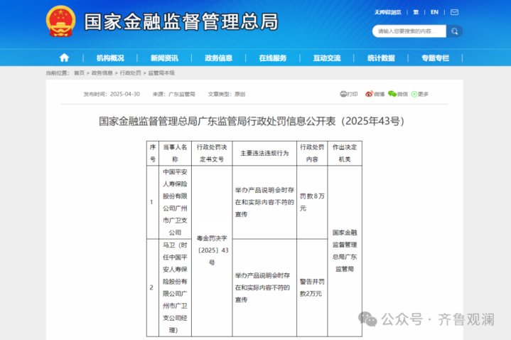 4月30日,平安人寿广州市广卫支公司被查获“举办产品说明会时存在和实际内容不符的宣传”的违法违规行为,被处以罚款8万元处罚。该公司时任经理马卫被处以警告并罚款2万元处罚。